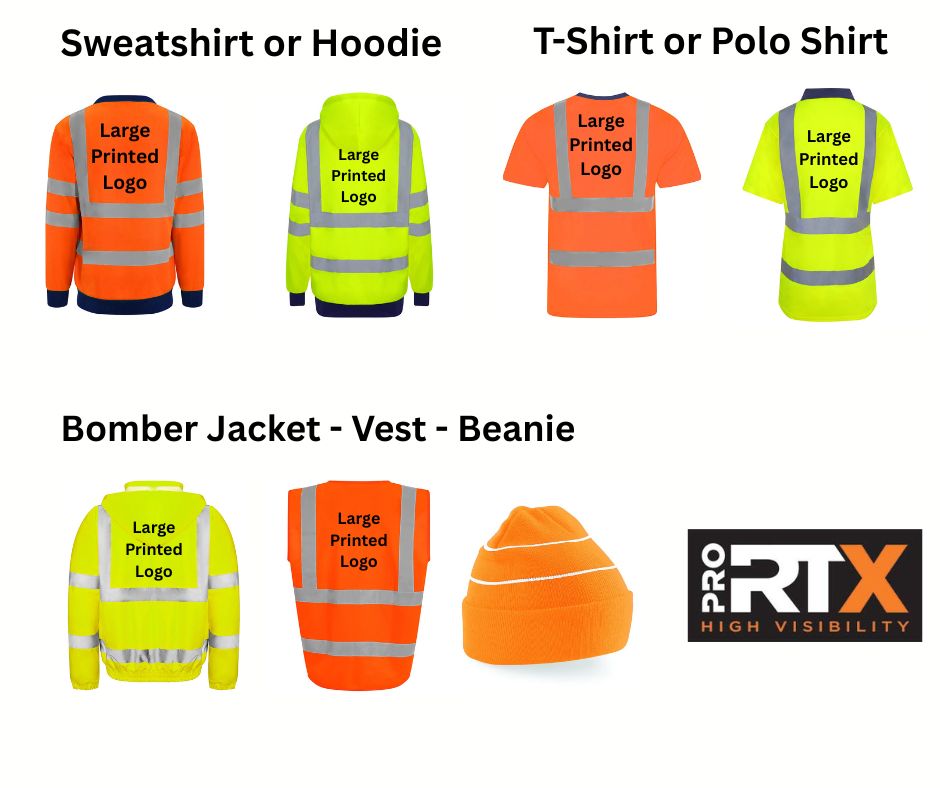All garments printed on the back for maximum visibility on site.